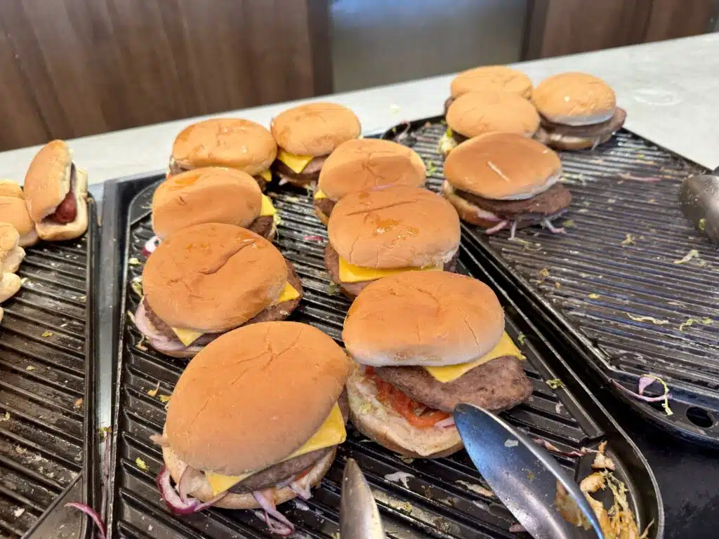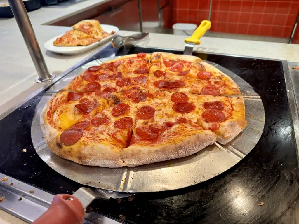 Lunch and dinner features a number of different stands with various food offerings. These include a pizza station, a pasta station, a salad bar, international hot entrees, charcuterie with meats and cheeses, and hamburgers and hot dogs.