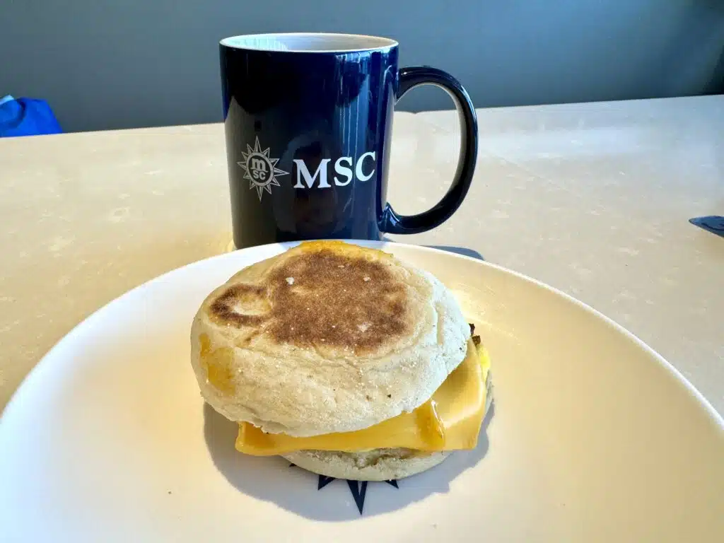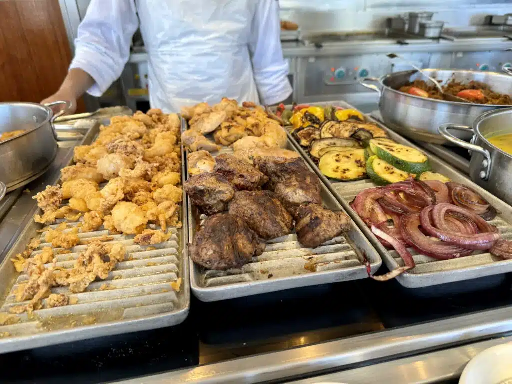 At breakfast, the Marketplace Buffet features your typical offerings. There is a custom egg and omelet station all the way aft in the venue. Additional menu items include options like scrambled eggs, breakfast meats, pancakes and waffles, and breakfast pastries. Cereal, fruit, and other continental items are available as well.