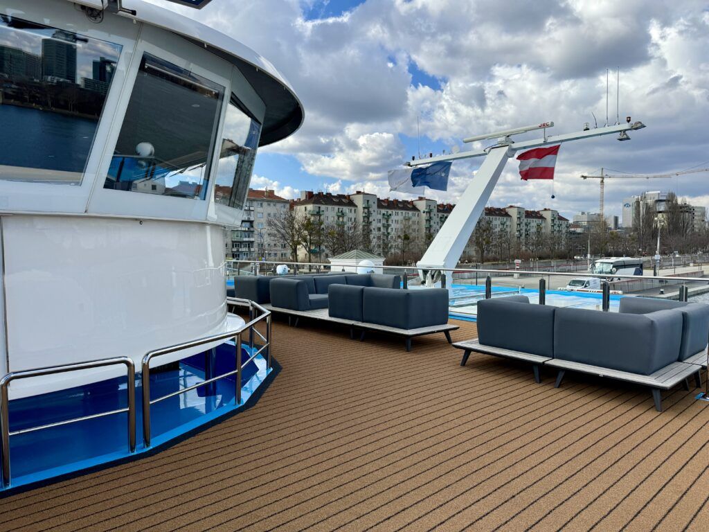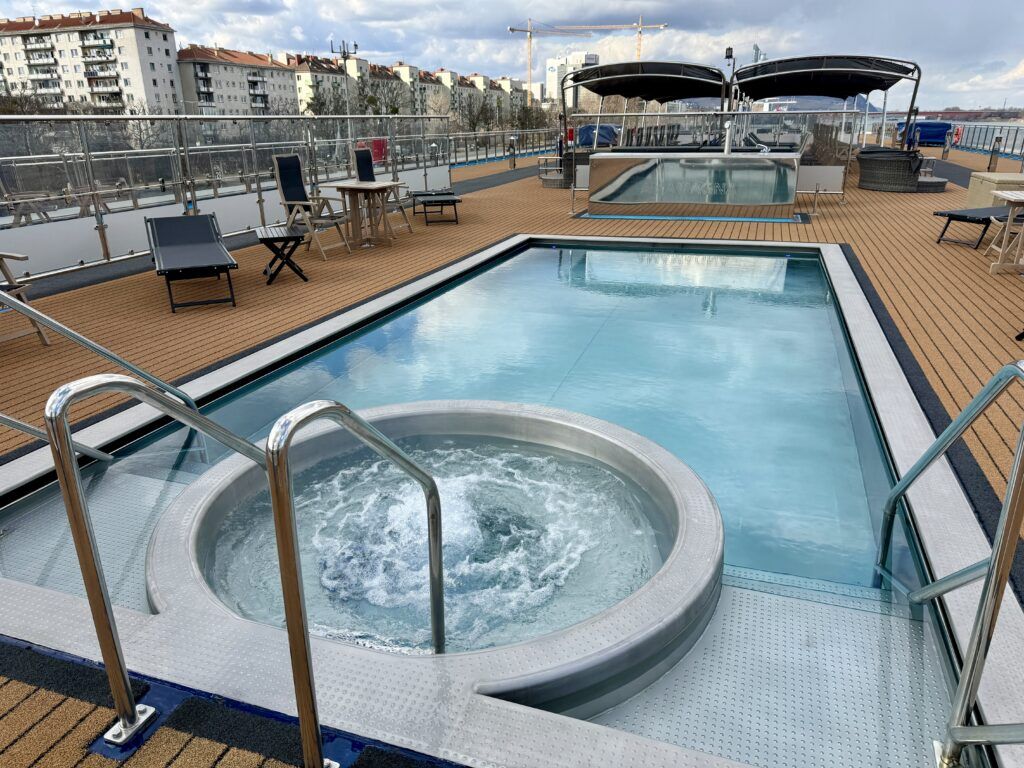 We enjoyed one warm afternoon on the outdoor decks during our sail back to Budapest. But during the warmer months, there are various loungers, tables and chairs, and sofas on the sundeck. There is also a pool and hot tub, which our last river ship did not feature. While it was cold during our February sailing, the pool water is heated, so some cruisers did make use of this space.