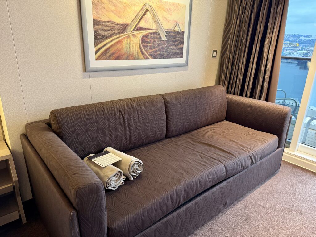 Immediately upon entering the room, our bathroom was on the left wall. Following the bathroom, there was the closet tucked around the corner and then the bed facing aft. The seating area (left wall) and desk (right wall) were in front of the balcony.